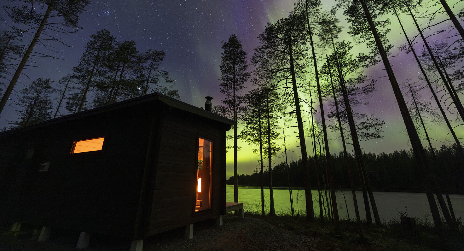 Kun näkee suomussalmelaisen erä- ja luontokuvaaja Hannu Hutun kuvat hänen uudelta saunatuvaltaan, haltioituminen on taattu. Uskomattomat revontulet tanssivat värikkäinä järven, rantamäntyjen ja tuvan yllä. Maisema on kuin suoraan matkailumainoksesta.