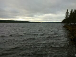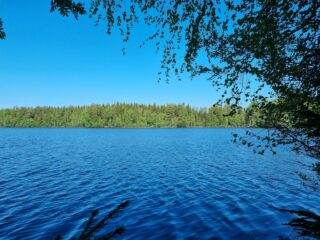 Koivut ja männyt reunustavat oikealla avautuvaa järvimaisemaa. Rantaviiva on kivinen.