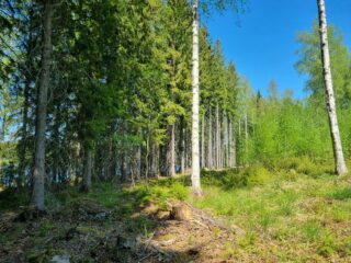 Syksyistä hyvin harvennettua kuusimetsää. Maassa heinä on vielä vihreää.