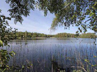 Järven rannalla kasvaa kunttaa ja sekametsää. Taustalla pilkistää sininen järvi.